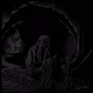 Deep inside of a cave, where the light and shadows play, a wise old woman spends her days weaving a beautiful garment.